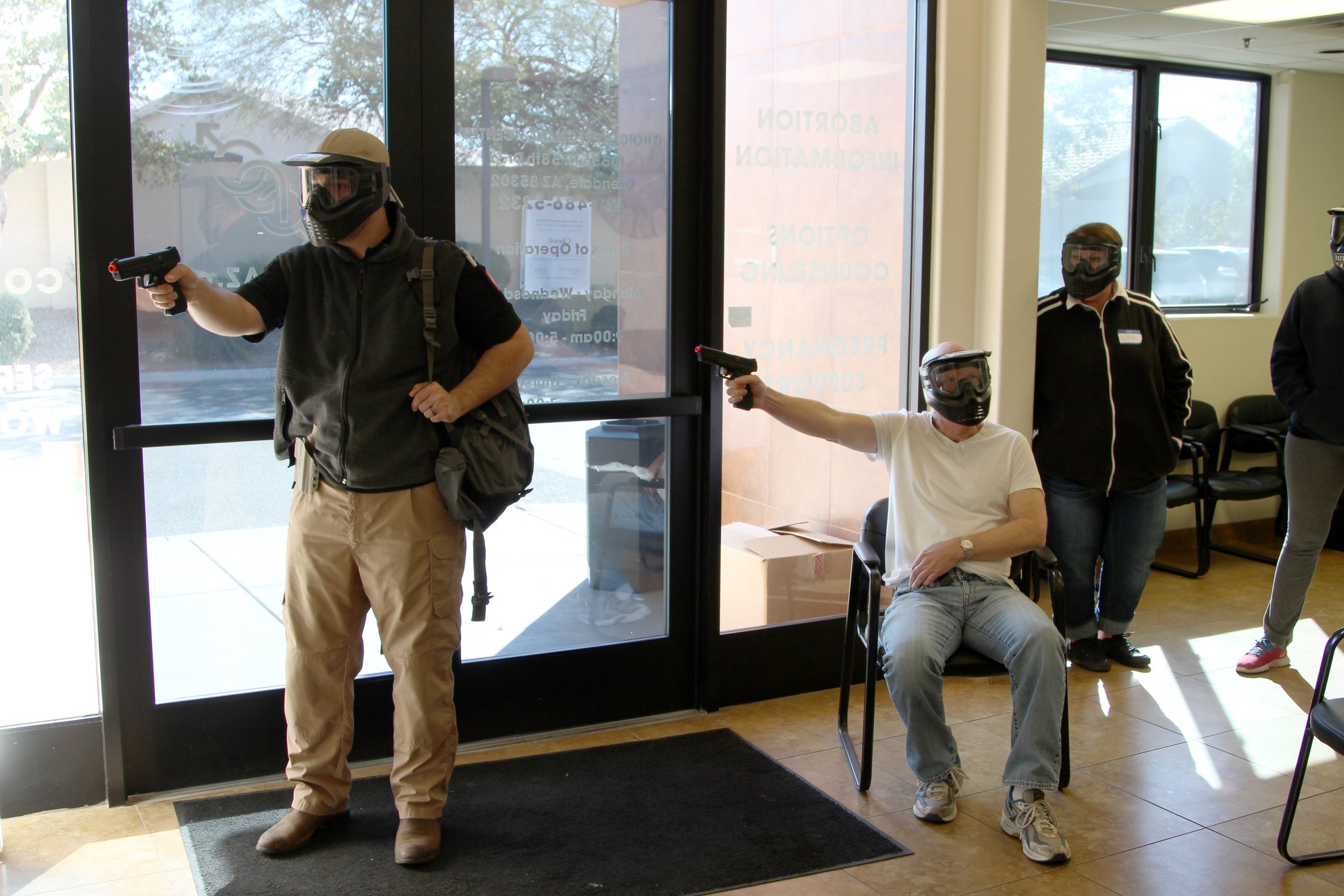 Persons will be taken into a room where the instructor and or RSO will give them their ‘rolls’ to play. Actors are encouraged to play out their role as ‘real world’ as possible, if you are told you’re a drunk, act it out, If you are told you’re a bank robber play the best bank robber you can play. Yelling and screaming is also encouraged as it gives the scenarios a much more real life fell.